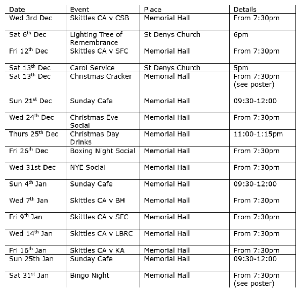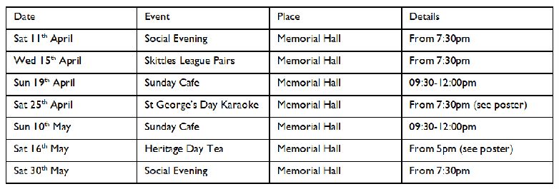 Everyone is welcome to join us for the following events and residents’ support will ensure that we are able to keep these important village facilities open and provide opportunities for entertainment, social interaction and keep the village pool and skittle teams going.