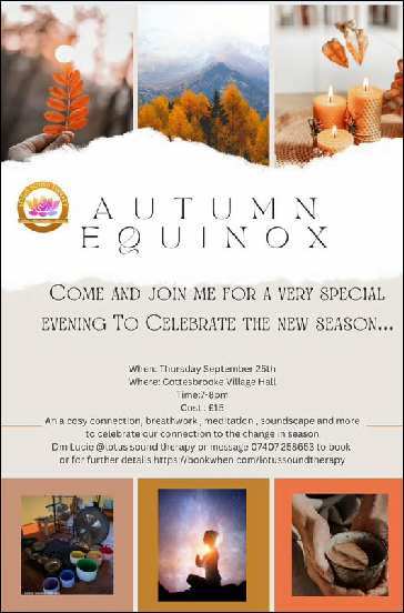 After a short summer break our monthly sound baths are back at the village hall. Sound baths are a great way to relax and find a sense of calm after a busy day. To book in please contact Lucie on 07407 258653. They are on the last Thursday of every month (exc December): Thursday 30th October, 27th November.