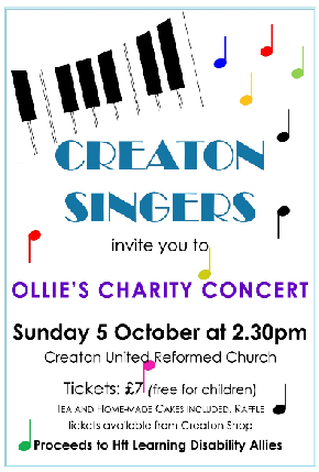 Have you seen the advert for Ollie’s Charity Concert on Sunday 5th October? It is at 2.30pm in the URC in Creaton. The Creaton Singers have been practising hard to put together a varied programme of familiar and not so familiar songs. Please come and help raise funds for Hft Learning Disability Allies, and support Ollie who is running the Athens marathon for this cause.