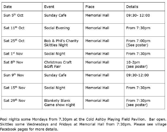 Thank you to everyone who has been joining us for our monthly café and social evenings. The money raised at these events goes to maintaining the upkeep of the Memorial Hall and is crucial for the hall’s survival. We are very grateful for the support shown, particularly from our friends that don’t live in the village who attend our events on a regular basis.