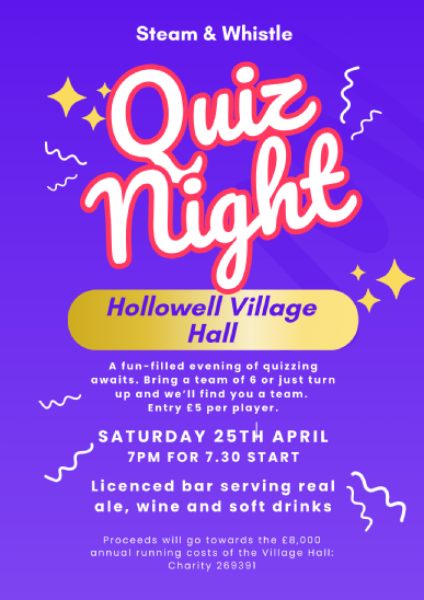 The next Hopewell dates are Friday 24th April and Friday 22nd May. Do come and join them 10.30am to 12.30pm in Hollowell Village Hall.